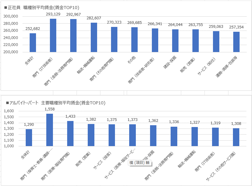 アルバイト・パートの前回比では、21職種中(「その他」は除外)10職種が増加、11職種が減少した。前月比で最も増加率が高かったのは、専門(保育士・教員・講師・インストラクター)(+5.1%)、次いで、農林漁業(+4.3%)となり、最も減少率が高かったのは、専門(技術者・研究者)(-2.5%)、次いで、警備(-1.4%)となった。前年同月比では、最も増加率が高かったのは、農林漁業(+7.6%)、次いで、専門(保育士・教員・講師・インストラクター)(+7.4%)となり、最も減少率が高かったのは、建設・採掘(-3.7%)、次いで、専門(医療・福祉専門職)(-3.2%)となった(アルバイト・パート/時給 職種別賃金参照)。