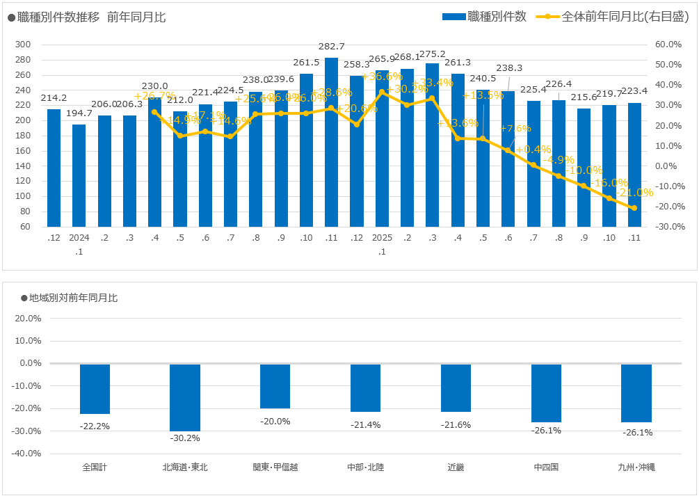 ●2025年11月の職種別求人広告件数は、全体で2,233,647件(前月比+1.7%/前年同月比-21.0%)となった。 傾向として、職種別求人広告件数全体は前月比は微増しており、前年同月比は2025年4月から減少傾向が続いている。