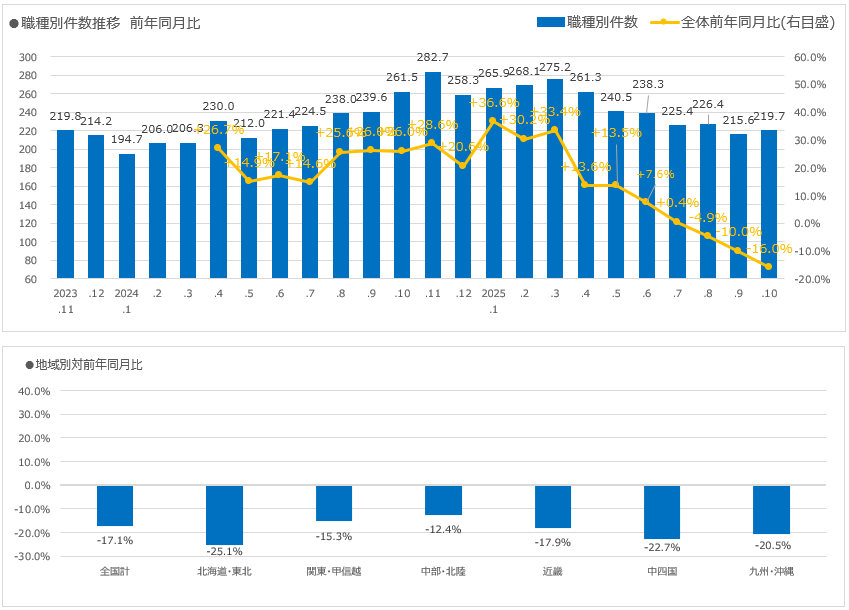 2025年10月の職種別求人広告件数は、全体で2,197,339件(前月差+1.9%/前年同月比-16.0%)となった。 傾向として、前月比は微増に転じているが、前年同月比では大幅な減少傾向が継続しており、特に事務職の落ち込みが大きい中で短期的にはIT技術者などが長期的には建設・採掘などが件数を支えている。