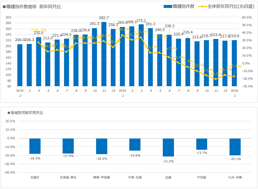 ●2026年1月の職種別求人広告件数は、全体で2,195,653件(前月差+0.8%/前年同月比-17.4%)となった。