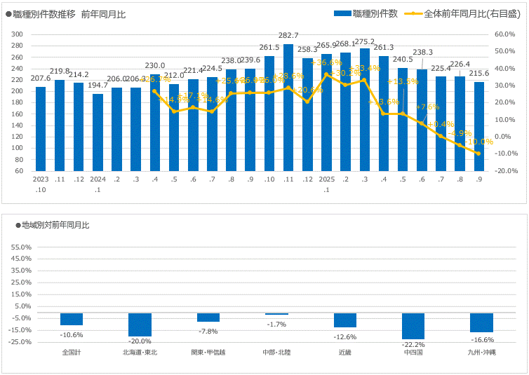 2025年9月の職種別求人広告件数は、全体で2,155,885件(前月差-4.8%/前年同月比-10.0%)となった。傾向として、2024年10月から2025年4月までは200万件後半で推移し、2025年5月からは200万件前半で推移している。前年同月比は2025年4月から減少傾向が続いている。